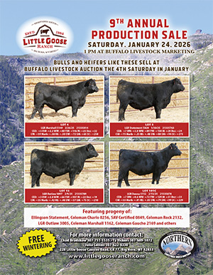 At Little Goose Ranch, our herd consists of approximately 200 mother cows plus replacement heifers. When we made the transition from a commercial cow calf operation to registered Angus, we started with a small group of purebred females from some of the best producers in the business as our foundation and have continued to increase our stocking rate as resources permit. Having a commercial cow/calf operation prior to transitioning to registered Angus gave us the knowledge and experience to select registered cattle for our environment. Our cattle are raised at the base of the Bighorn Mountains, which means the cattle must be structurally sound and able to graze on grass in the steep rocky foothills.